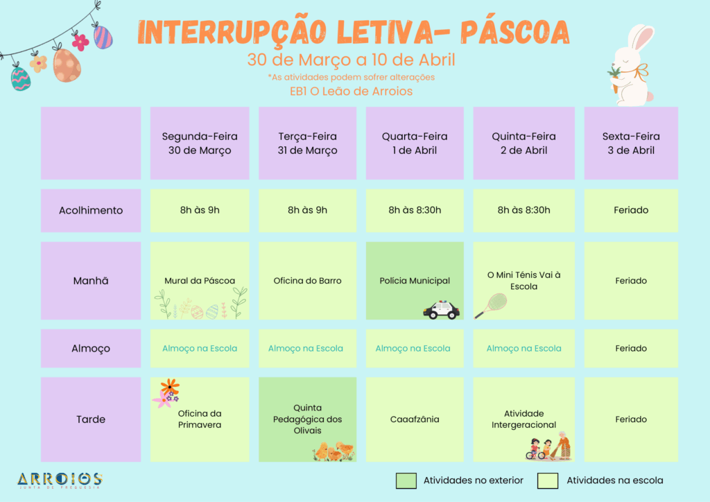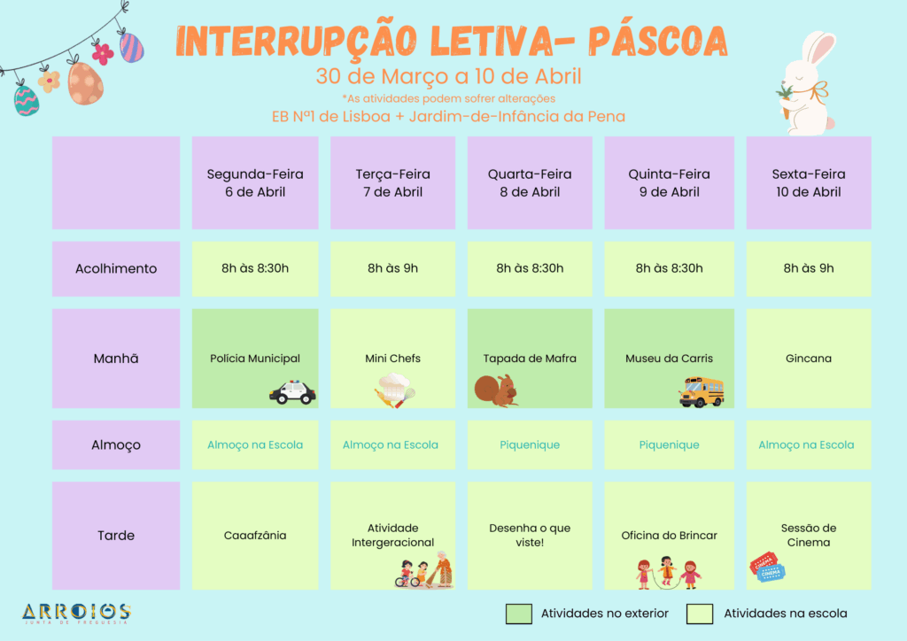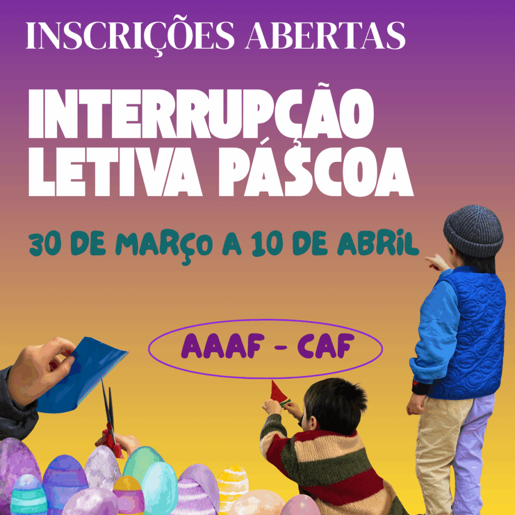 Durante os dias 30 de março e 10 de abril, a Interrupção Letiva da Páscoa contará com um programa especialmente preparado para as crianças inscritas nas Atividades de Animação e Apoio à Família (AAAF) e na Componente de Apoio à Família (CAF) da nossa Freguesia.