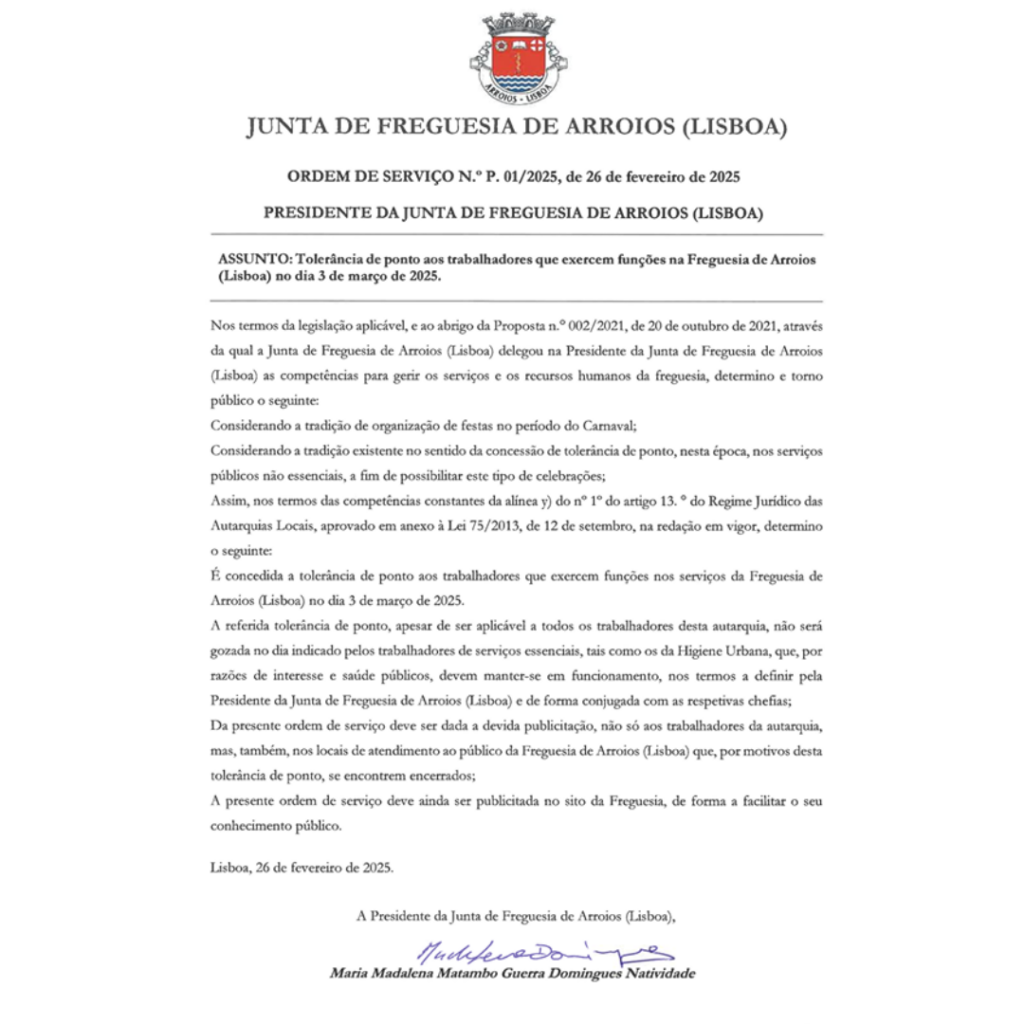 É concedida a tolerância de ponto aos trabalhadores que exercem funções nos serviços da Freguesia de Arroios (Lisboa) no dia 3 de março de 2025.