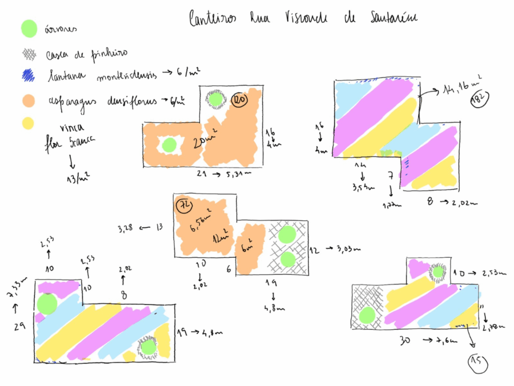 Desenho de estudo do projeto de requalificação dos canteiros: base para a seleção das espécies e organização do espaço.
