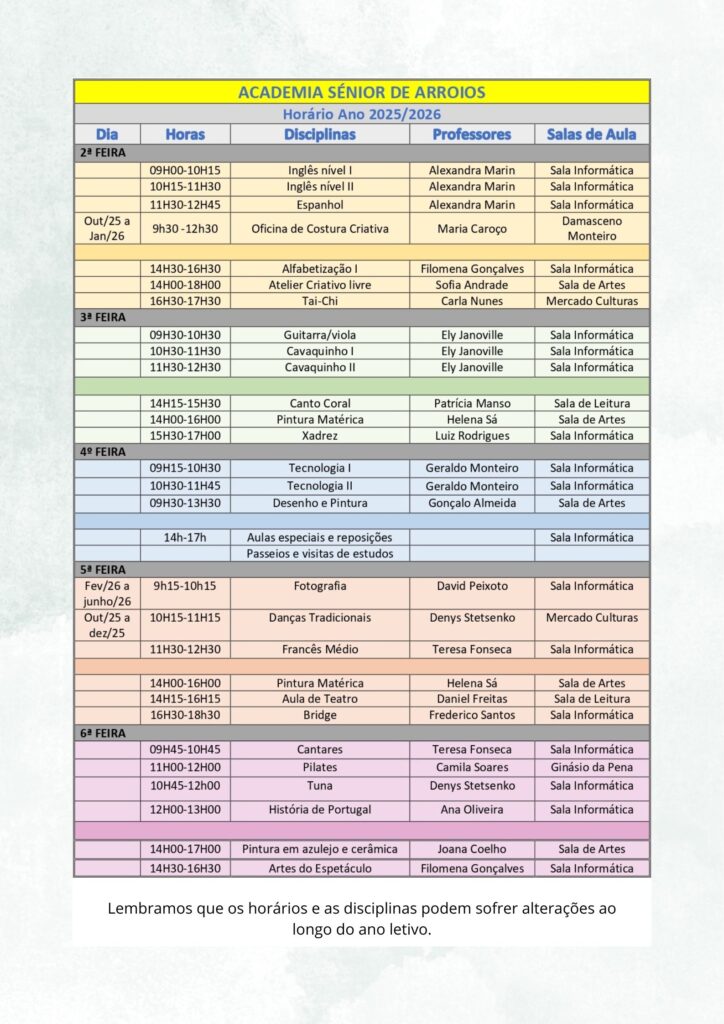 As aulas decorrem de segunda a sexta-feira, durante um ano letivo, em várias das instalações pertencentes à Freguesia de Arroios.